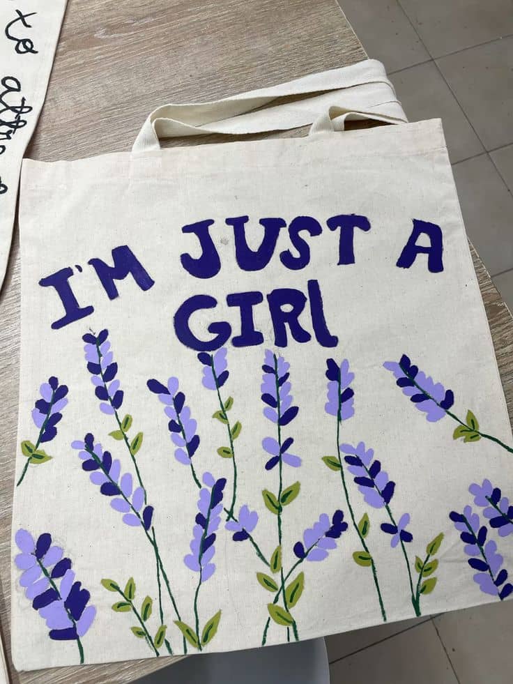 16. Lavender “I’m Just a Girl” Painted Tote Bag